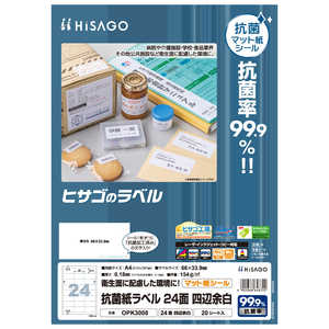 ヒサゴ 〔各種プリンタ〕抗菌紙ラベル 四辺余白 0.12mm [A4 /20シート /24面 /マット] OPK3008